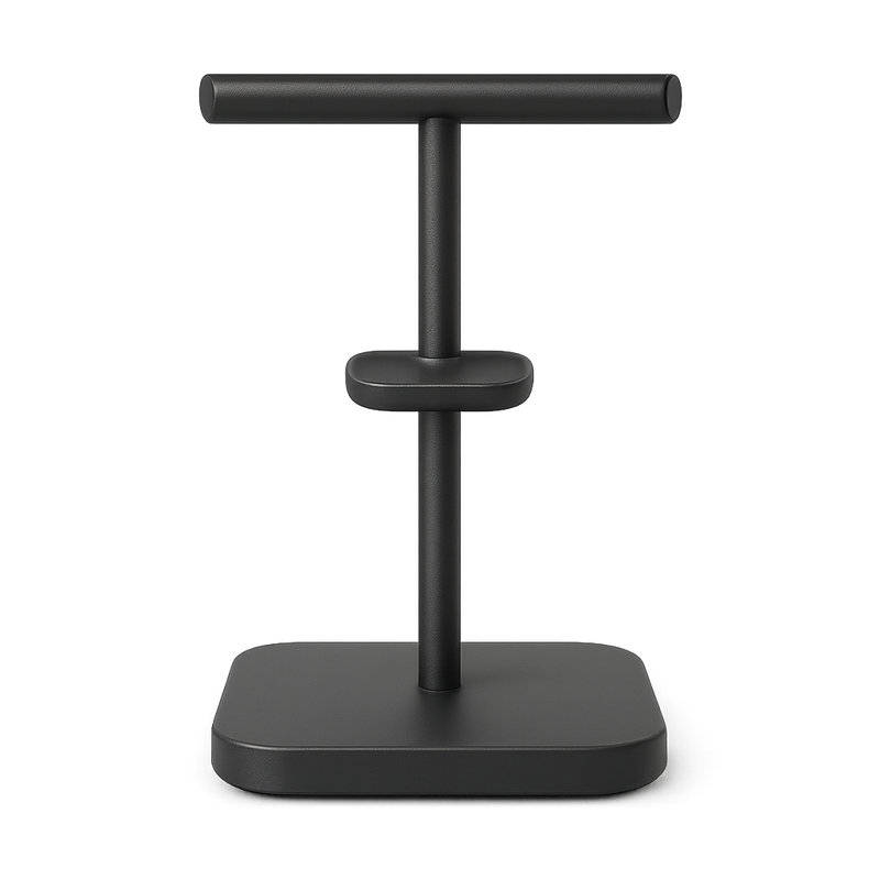 Dual headphone stand with integrated cable holder and non-slip base. Holds one or two headsets securely for organized storage.